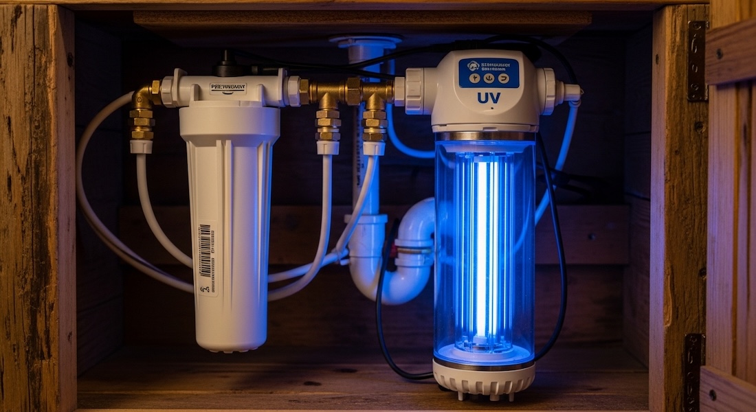 For full-time off-grid homes relying on rainwater or untreated wells, UV purification adds critical protection. This is the same technology many municipal systems use — just scaled down for home use.